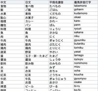 食べ物(たべもの)、お菓子(おかし)、料理(りょうり)、鱼(さかな)、牛肉(ぎゅうにく)、豚肉(ぶたにく)、鶏肉(とりにく)、野菜(やさい)、玉子(たまご)、ビール