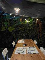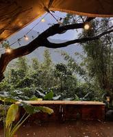 悬挂着灯串、餐具整齐摆放在木头餐桌上,紧邻着山壁用餐还是一次,太喜欢这边的环境了!