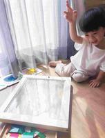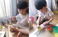 接着让宥宥随意贴上窗户,因为没有做缺角对於孩子可能不太好撕开,妈妈可以帮忙撕开一小角再让孩子操作。